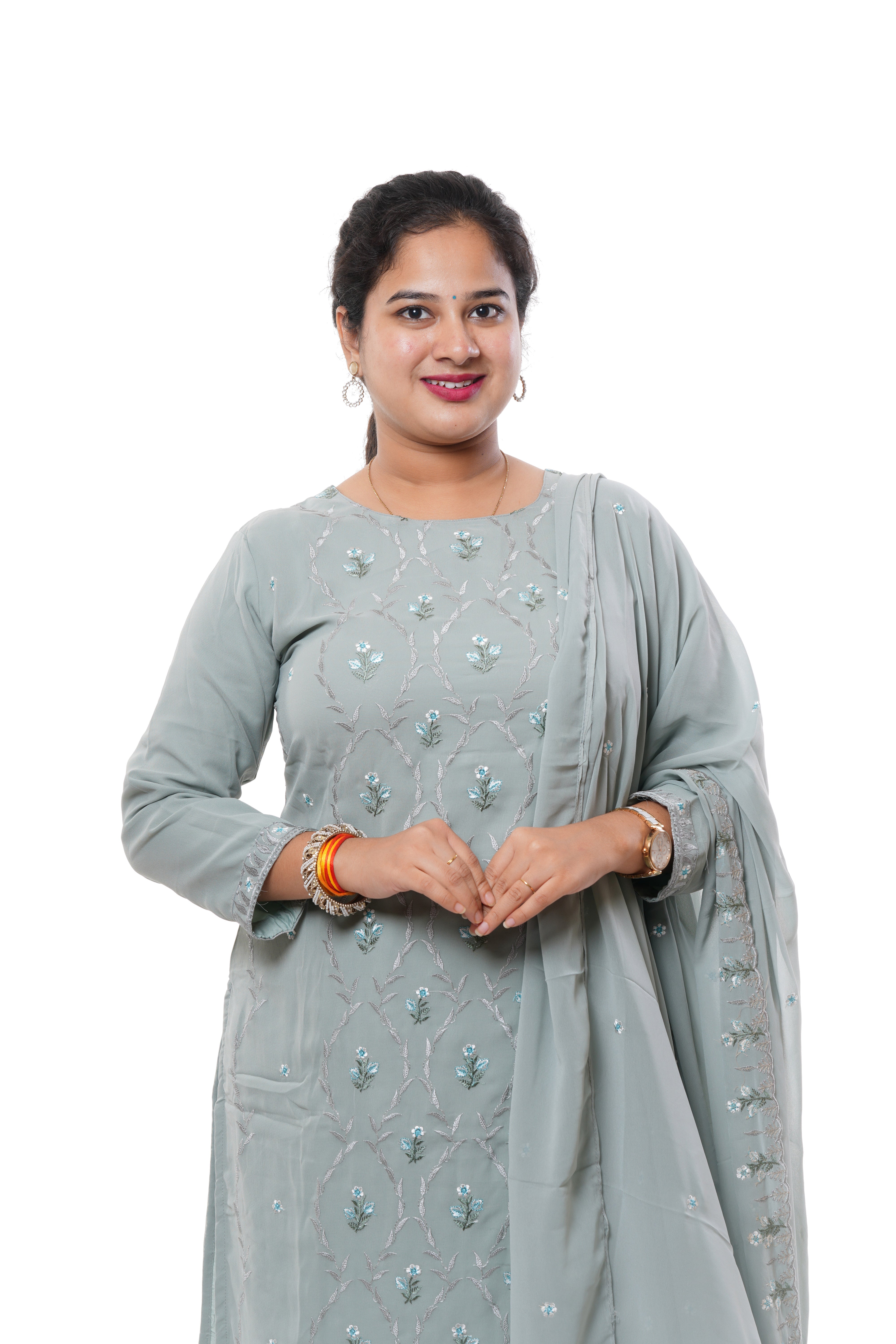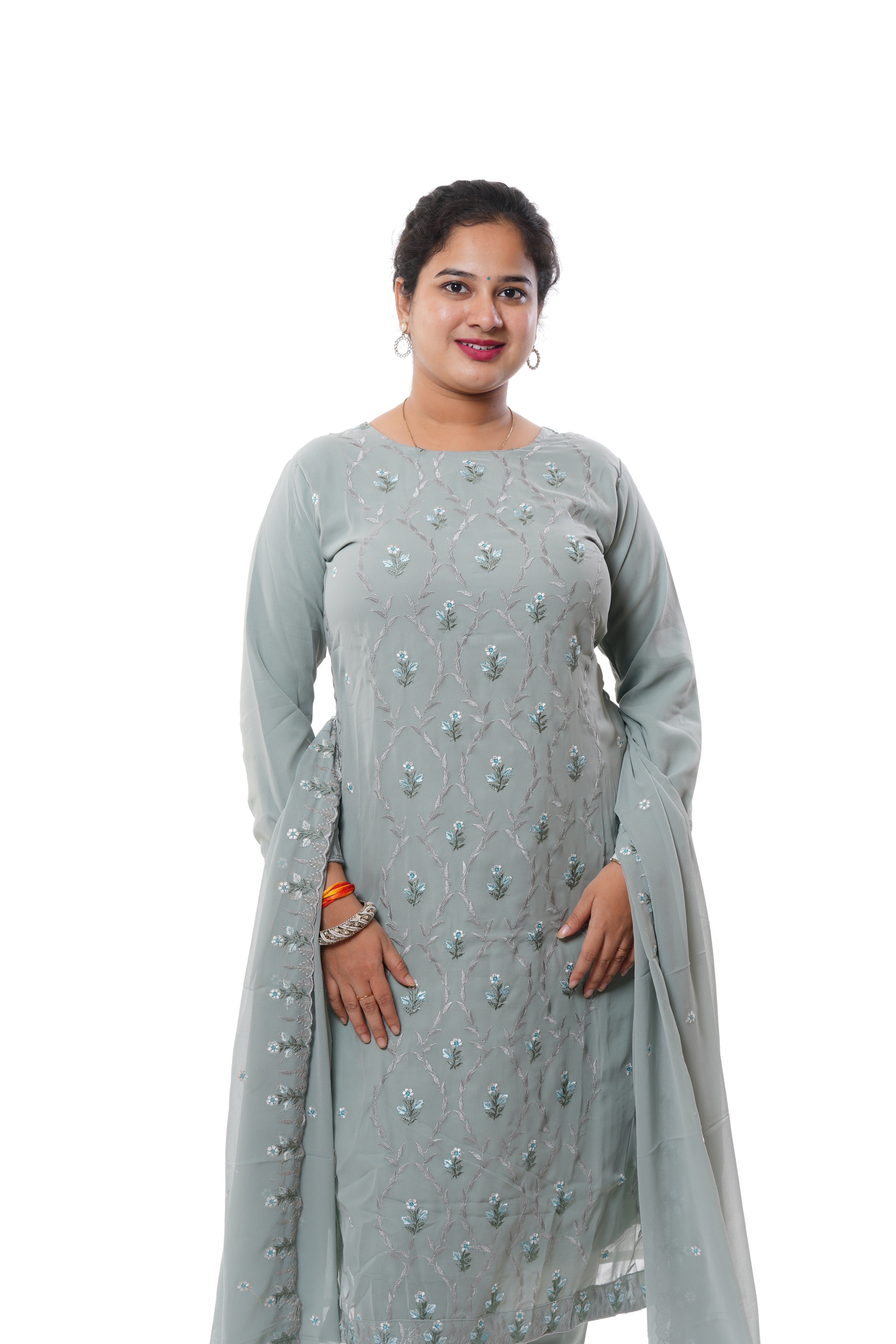 Step into elegance with this grey georgette embroidered 3-piece kurti set, designed for timeless charm. Crafted from soft and flowy georgette, this set features intricate embroidery work that adds a touch of sophistication. It includes a beautifully embroidered kurti, a matching bottom, and a graceful dupatta, making it perfect for festive occasions, parties, and formal gatherings. Stay effortlessly stylish and comfortable in this exquisite ethnic ensemble.