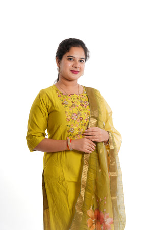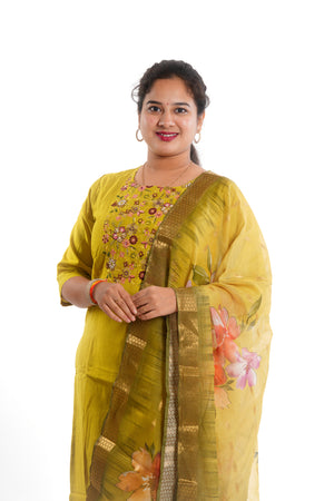 Step into effortless elegance with our 3-piece cotton kurti set, crafted in a vibrant mustard yellow hue. The set features a beautifully embroidered straight-cut kurti adorned with delicate floral threadwork on the front yoke. Paired with matching cotton pants and a light, organza-style dupatta showcasing a stunning floral print and zari border, this outfit strikes the perfect balance between tradition and trend.