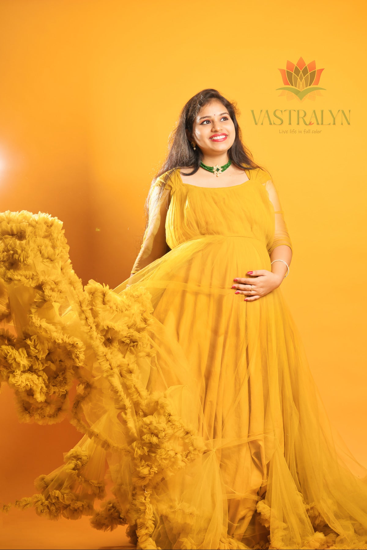 Capture the glow of motherhood in this elegant orange maternity gown, designed specially for photoshoots and baby showers. Made from soft and lightweight net fabric, this flowy gown beautifully drapes around your bump, offering comfort and style. The sheer sleeves and layered design add a dreamy, fairy-tale touch—perfect for indoor or outdoor maternity sessions.