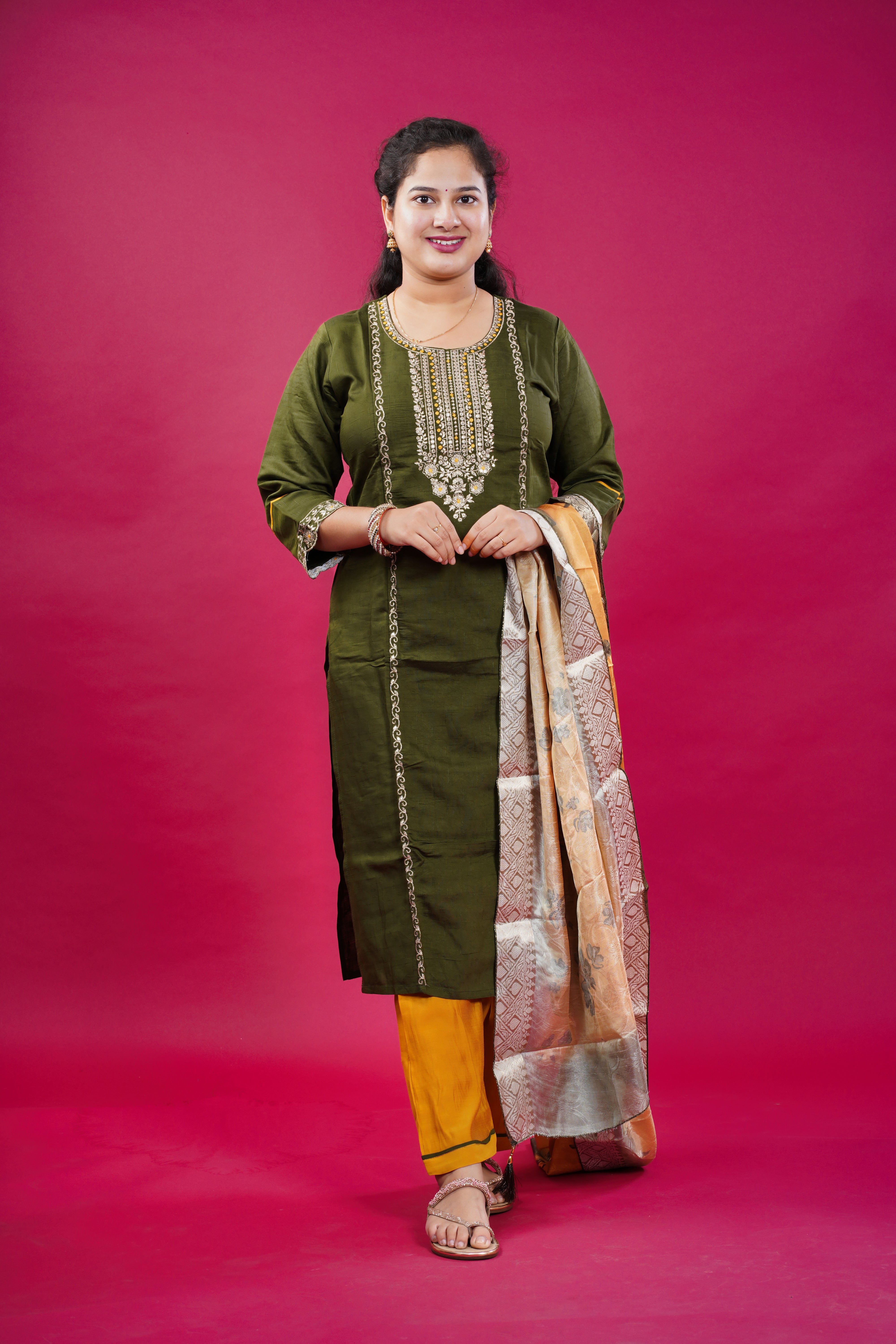 Color: Olive Green Kurti with Mustard Bottom & Designer Dupatta