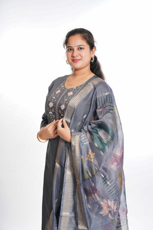 Grey Muslin Cotton Embroidered 3-Piece Kurti Set-Vastralyn