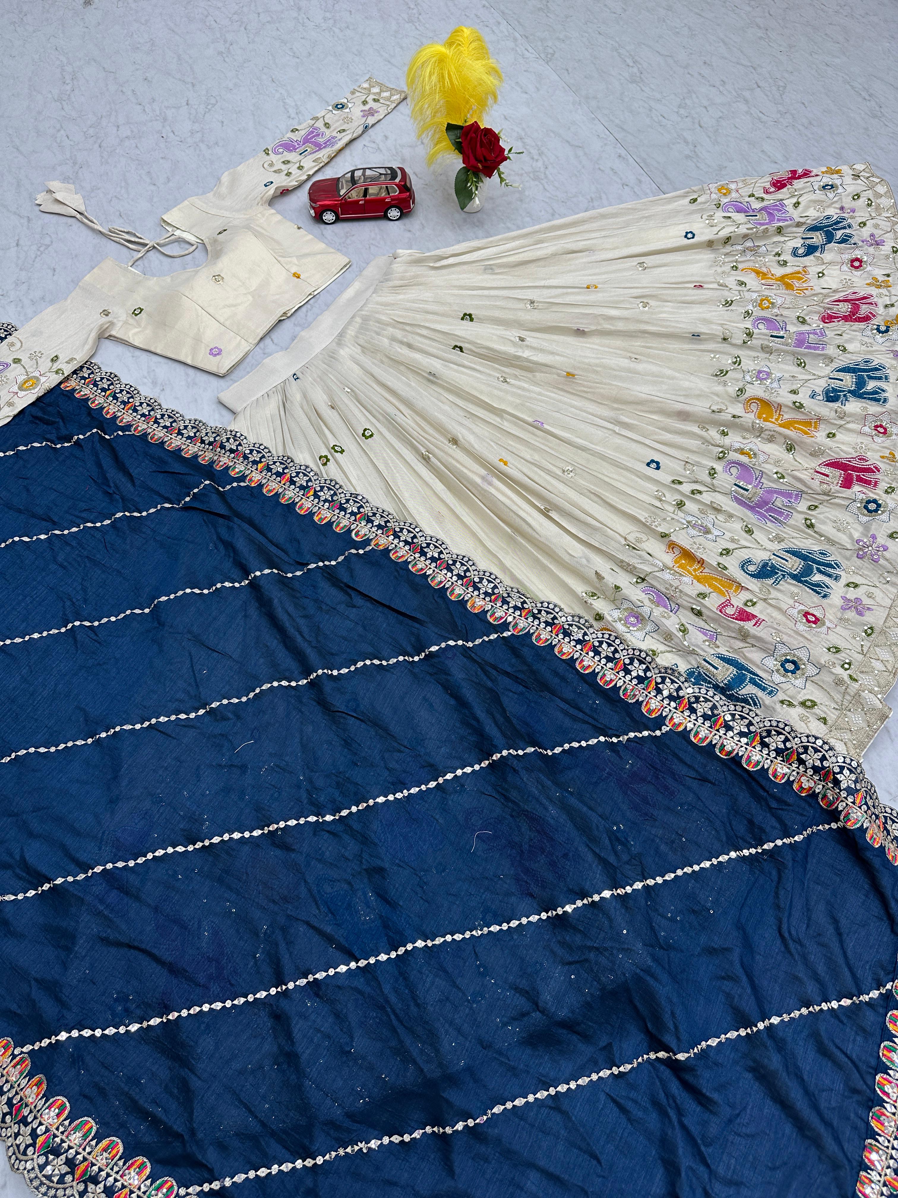 Celebrate tradition in style with this exquisite off-white lehenga choli set featuring vibrant multicolored elephant embroidery. Crafted in premium pure tissue silk, this lehenga is fully stitched with cancan and canvas for a voluminous flare. The choli boasts heavy thread and sequin work on soft micro cotton lining, while the dark green Vichitra silk dupatta with 4-side cutwork and 7MM sequin lace adds a luxurious touch. Perfect for festive occasions, Navratri, weddings, and cultural events.