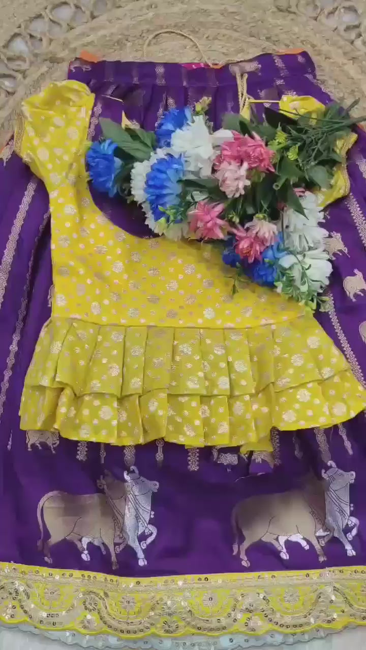 Elevate your little one’s festive style with our premium Hit Design Pattu Paavadai & Sattai Dress! 🌺 The lehenga is made from rich Russian Dola Silk with a unique cow weaving border, cutwork embroidered lace, and playful tassels for a royal finish. Paired with a soft nylon dola silk blouse, this outfit brings together grace and comfort. The full pure cotton lining ensures a cozy fit for long celebrations. Ideal for weddings, festivals, and traditional events.