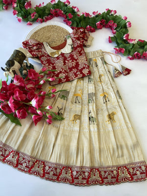 🦁 Lehenga: Heavy soft Banarasi silk with Kanjivaram weaving, meenakari border & elegant cutwork embroidery lace with unique tassels