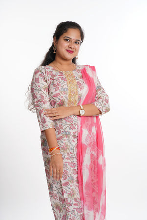Women's Rayon Capsule Foil Print Kurti Pant Set with Embroidery & Nazmin Cotton Dupatta